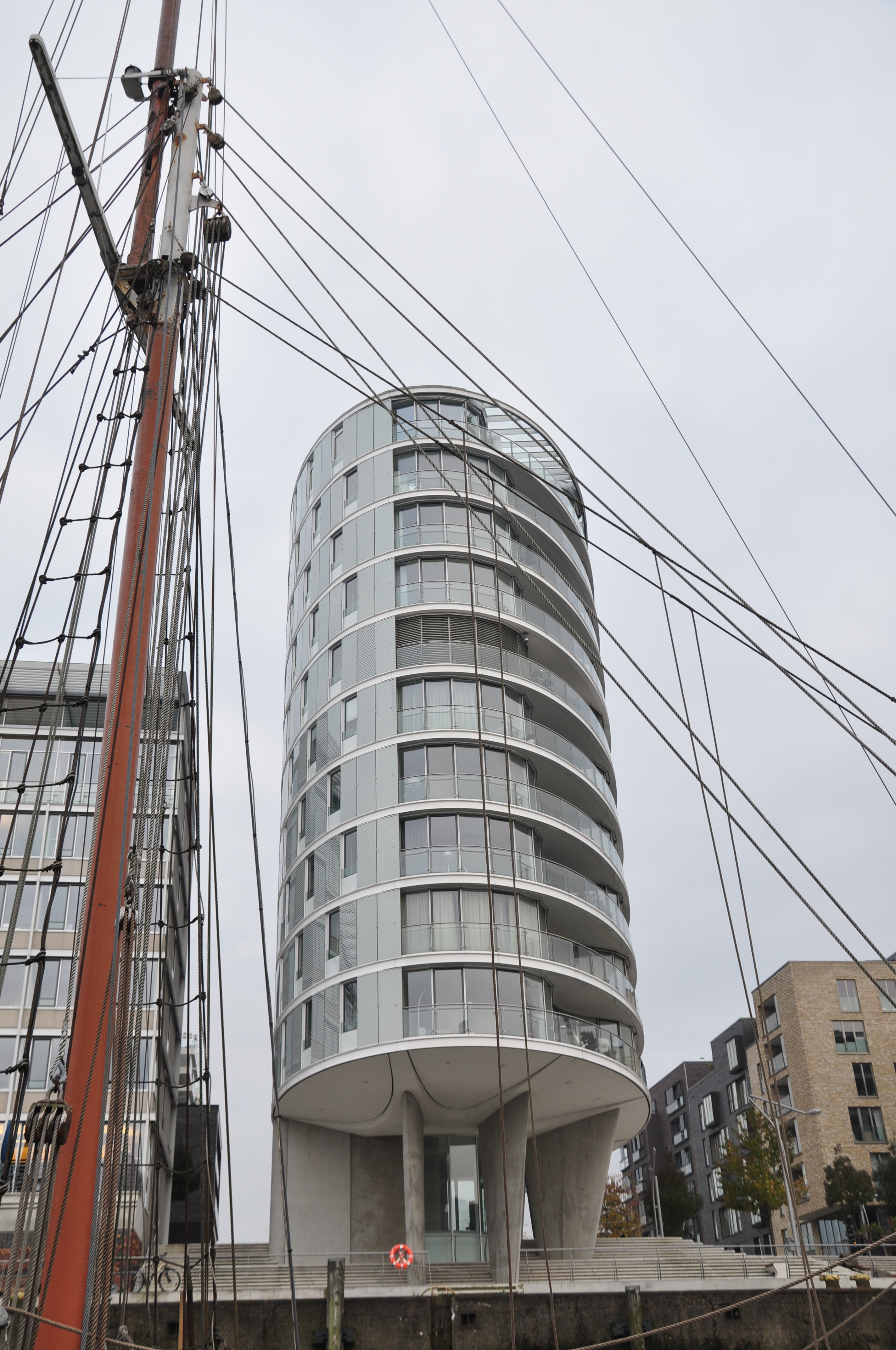 - Das Oval am Kaiserkai von Ingenhoven Architekten hat einen elliptischen Grundriss und steht auf Ständern. Die Form des Gebäudes ist nach intensiven Untersuchungen so festgelegt worden; unter anderem Windbedingungen, Sonnenstand und Lärmbelastung wurden untersucht.